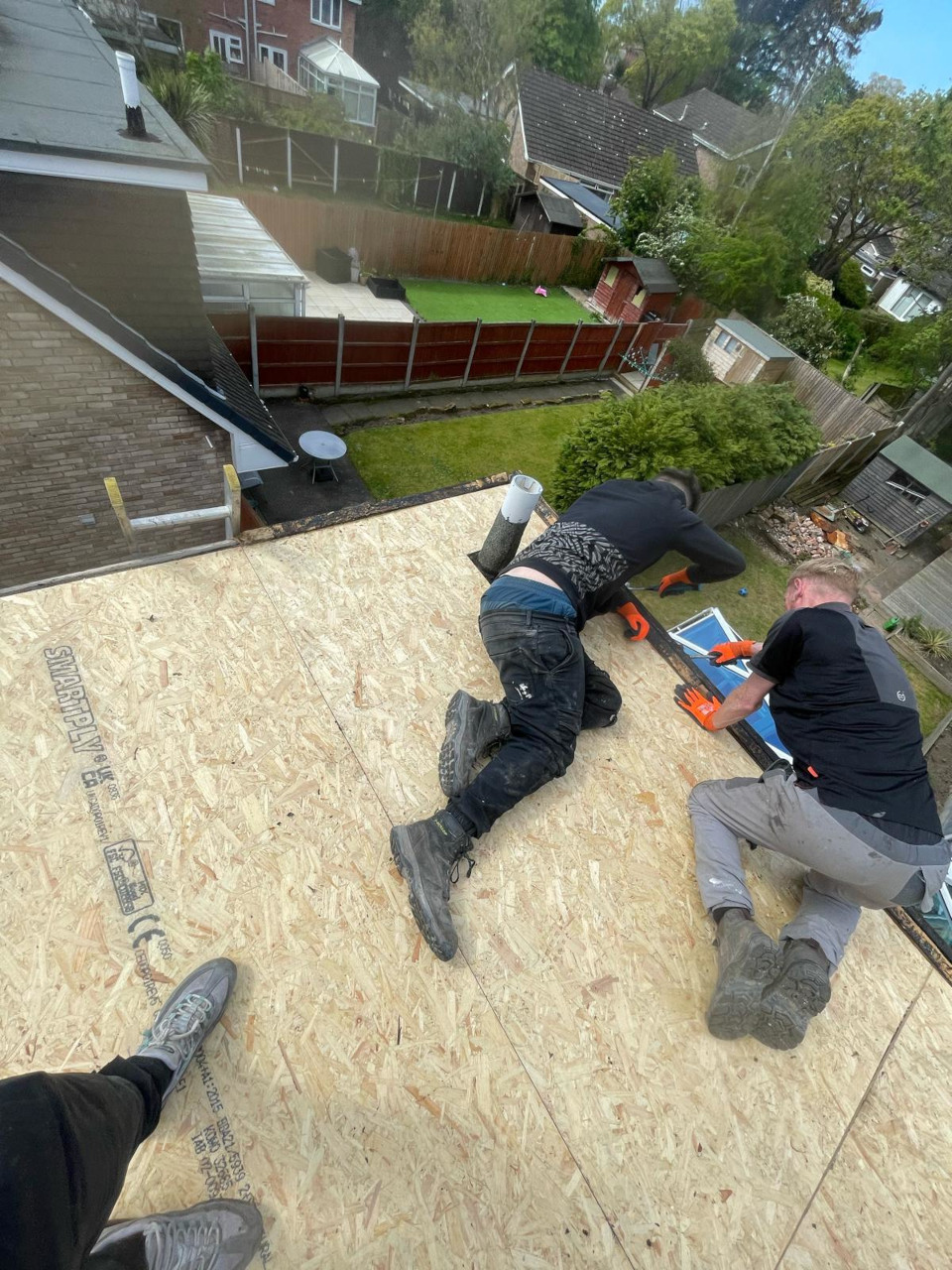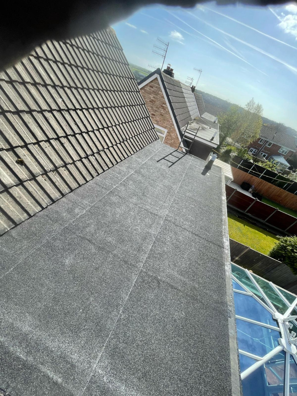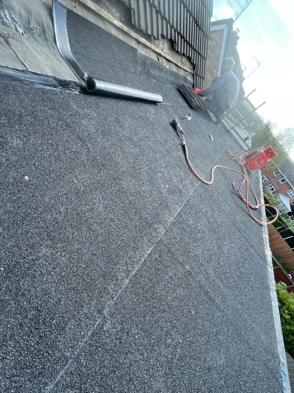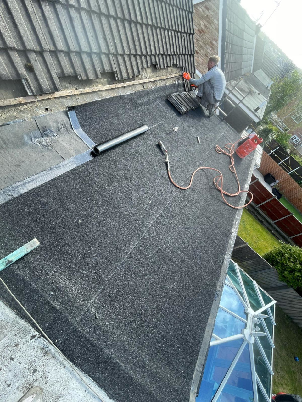 Sequence of work showing repairs to a flat roof on a dormer. 3-ply felt with staggered joints. Lap under existing tiles. Mineral felt top layer.