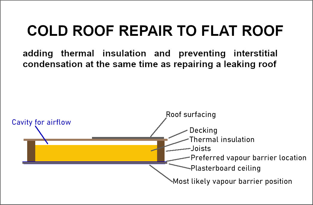 This is the most common type of flat roof. The thermal insulation is placed above the ceiling with a vapour barrier below and provision for air cross flow over the insulation to remove moisture vapour. The roof deck is on the 'cold' side of the structure.