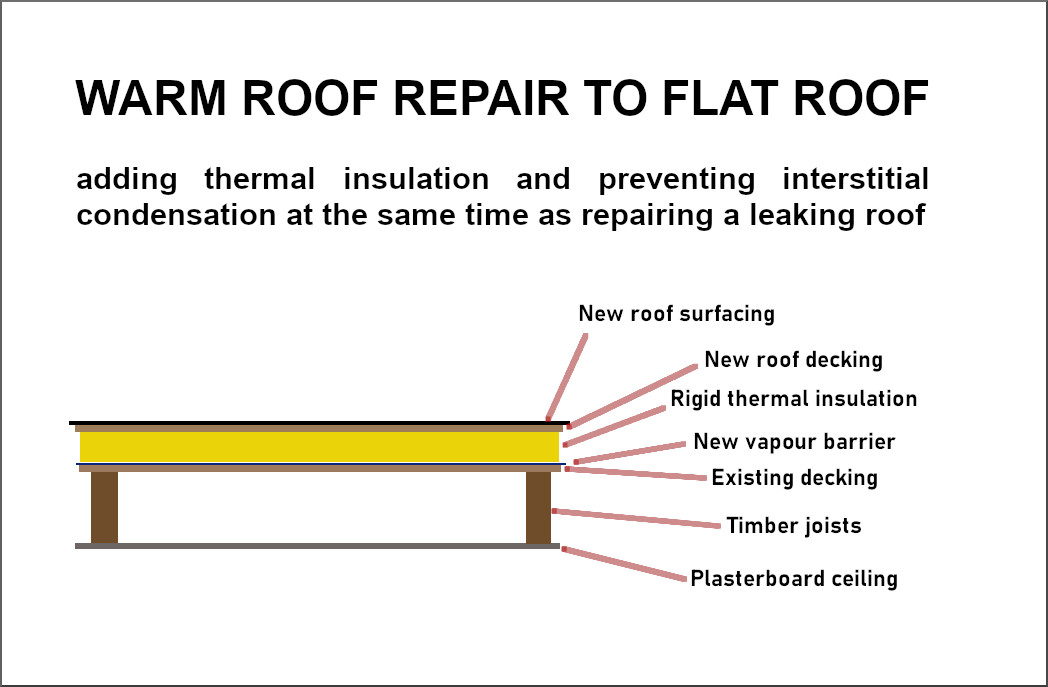 A 'warm' roof is when the thermal insulation is on top of the roof deck. This might be because the roof is made of concrete and it is not possible to place insulation below the deck, or when an existing flat roof is upgraded — possibly because the waterproof felt has degraded and is to be removed — but the original deck can be undisturbed.