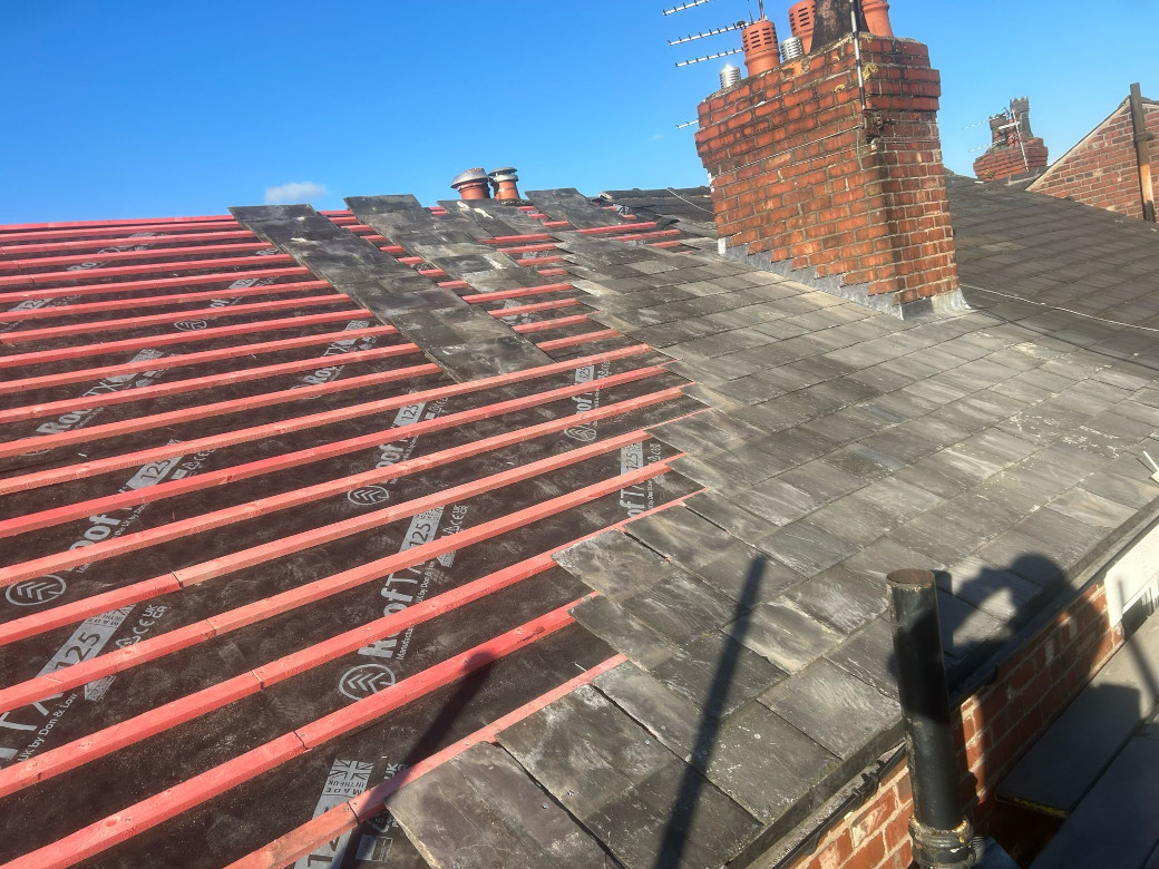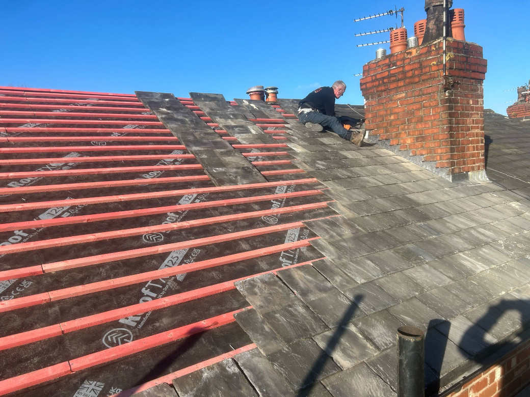 New sections of chimney leadwork, new vapour permeable sarking membrane, new treated battens, re-using existing roof slates and replacing any damaged with selected reclaimed matching slate.