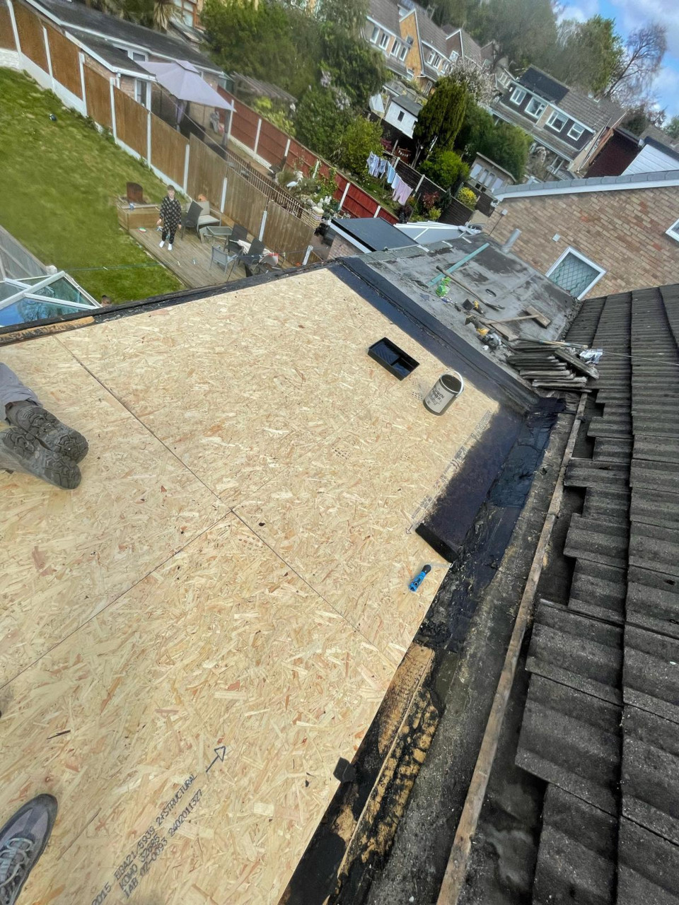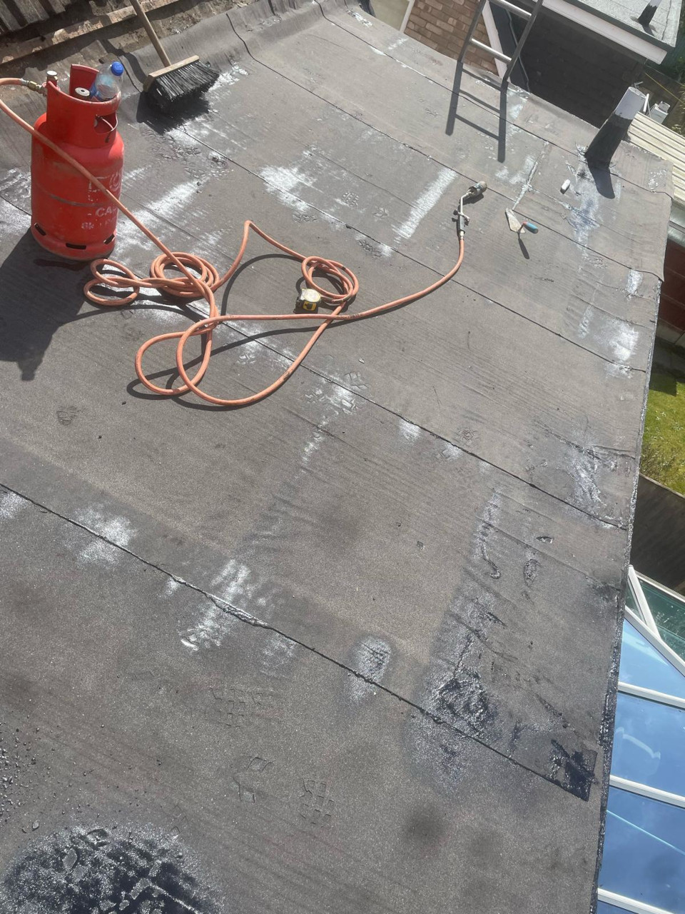 Sequence of work showing repairs to a flat roof on a dormer. 3-ply felt with staggered joints. Lap under existing tiles. Mineral felt top layer.