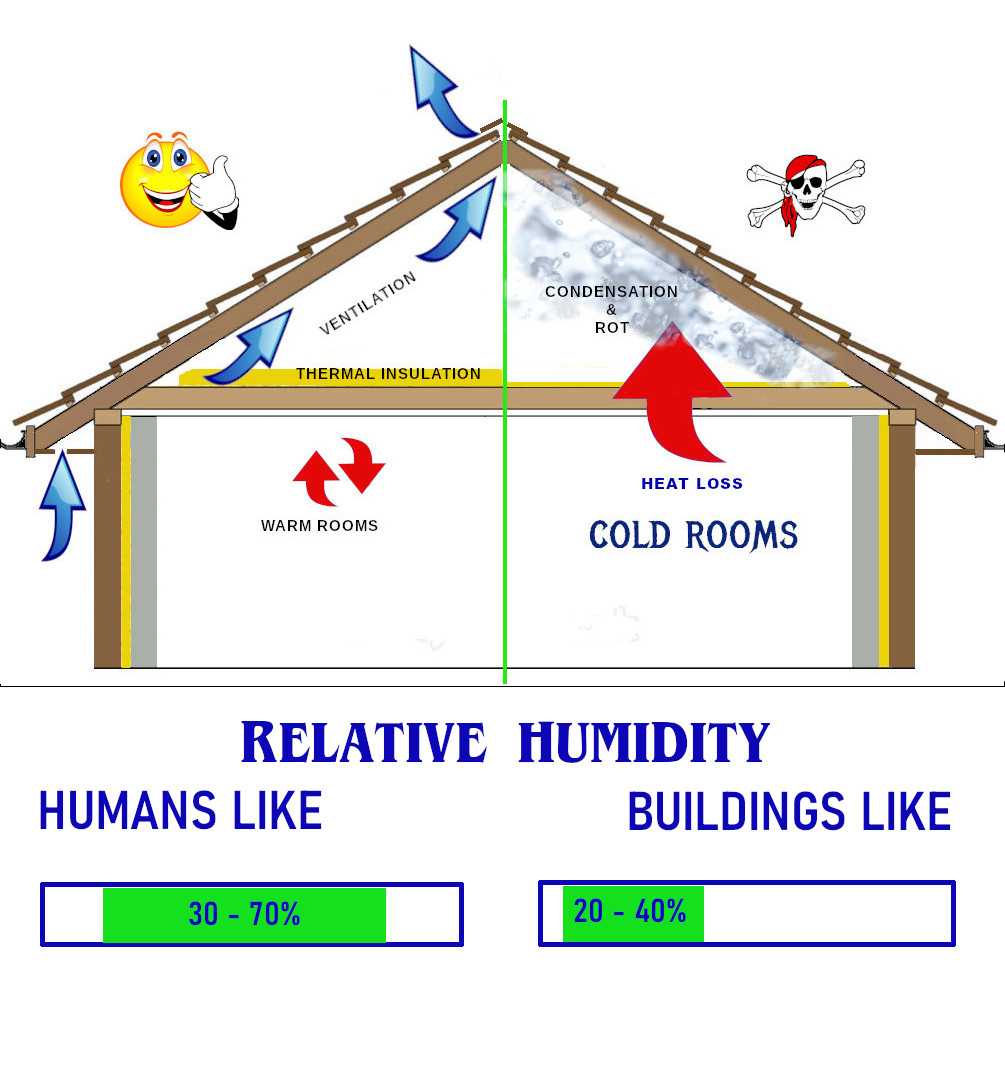 High levels of mositure can form in roof spaces because warm moist air causes vapour pressure that causes the moisture to rise upwards through the building, eventually condensing on the underside of the roof structure where the warm air meets colder air.