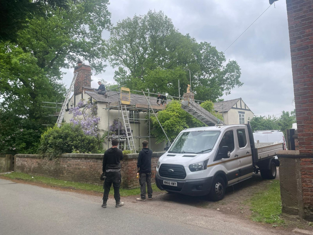 Extensive repairs to a cottage roof in Disley using matching reclaimed slates. Also new chimney flashing and re-pointing, and re-pointing of ridge tiles.