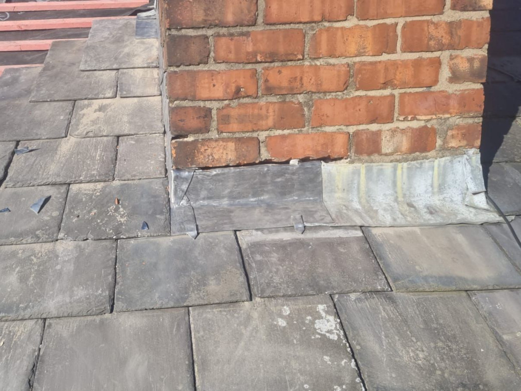 New sections of chimney leadwork, new vapour permeable sarking membrane, new treated battens, re-using existing roof slates and replacing any damaged with selected reclaimed matching slate.